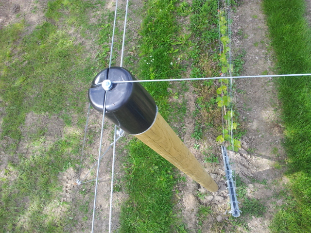 The post cap enables wires and cables to be guided safely and smoothly over wooden posts. At the centre of the cap is a bolt with washers, through which the wires can be tensioned without coming into contact with the wood.