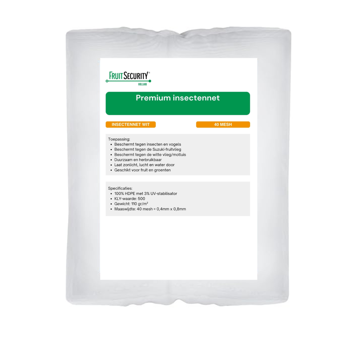 The insect net is made of 100% HDPE with UV stabiliser and has a KLY value of 500, which means it has a lifespan of 4-6 years under conditions such as those in the Netherlands.
